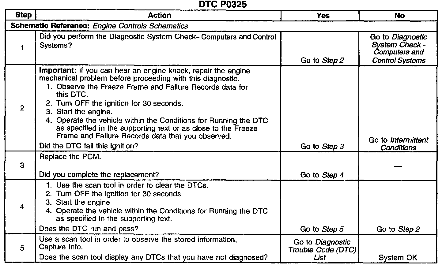 CIRCUIT DESCRIPTIONThe knock sensor (KS) produces an AC voltage at all engine speeds and loads. The powertrain control module (PCM) then adjusts the spark timing based on the amplitude and frequency of the KS signal. The PCM uses the KS signal to calculate the average voltage. Then the PCM assigns a voltage value. The PCM checks the knock sensor and related wiring by comparing the actual knock signal to the assigned voltage range. A normal KS signal should stay within the assigned voltage range. This DTC will set if the PCM malfunctions in a manner that will not allow proper diagnosis of the KS system.