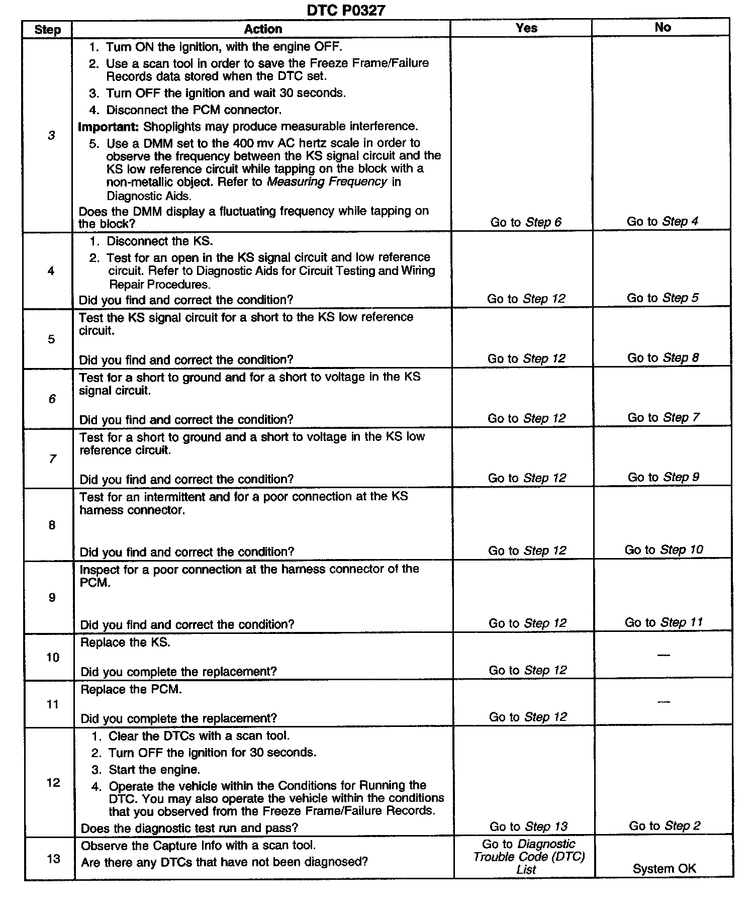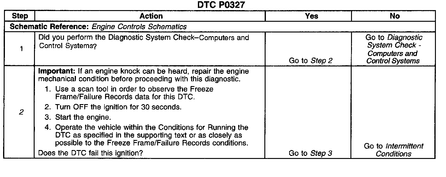 CIRCUIT DESCRIPTIONThe knock sensor (KS) produces an AC voltage at all engine speeds and loads. The powertrain control module (PCM) adjusts the spark timing based on the amplitude and frequency of the KS signal. The PCM uses the KS signal in order to calculate the average voltage. The PCM assigns a voltage value. The PCM checks the KS and the related wiring by comparing the actual KS to the assigned voltage range. A normal KS signal should stay within the assigned voltage range. This DTC will set if the KS signal is outside the assigned voltage range or if the signal is not present.