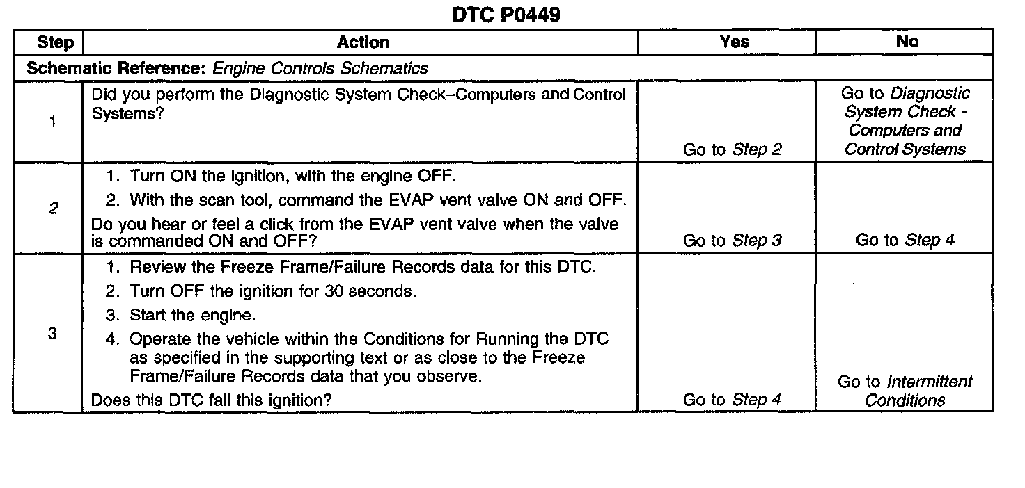 CIRCUIT DESCRIPTIONAn ignition voltage is supplied directly to the evaporative emissions (EVAP) vent valve. The control module controls the EVAP vent valve by grounding the control circuit via an internal switch called a driver. The primary function of the driver is to supply the ground for the controlled component. The control module monitors the status of the driver. If the control module detects an incorrect voltage for the commanded state of the driver, DTC P0449 sets
