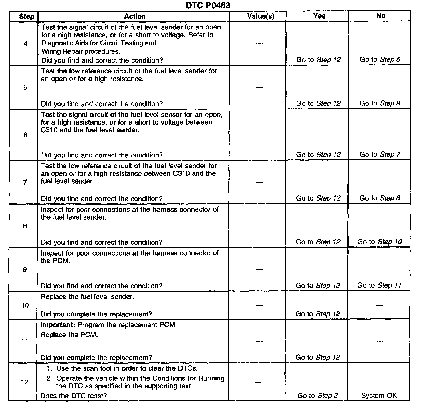 CIRCUIT DESCRIPTIONThe fuel level sender changes resistance in response to fuel level. The PCM monitors the signal circuit of the fuel level sender in order to determine the fuel level. When the fuel tank is full, the sender resistance is high and the PCM senses a high signal voltage. When the fuel tank is empty, the sender resistance is low and the PCM senses a low signal voltage. The PCM uses the signal circuit of the fuel level sender in order to calculate the percentage of fuel remaining in the tank. The PCM sends the fuel level percent via the class 2 serial data circuit to the instrument cluster in order to control the fuel gage. The fuel level information is also used for misfire and EVAP diagnostics.