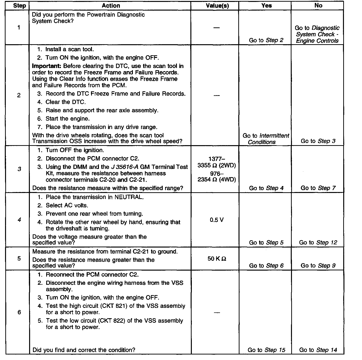 The numbers below refer to the step numbers on the diagnostic table.