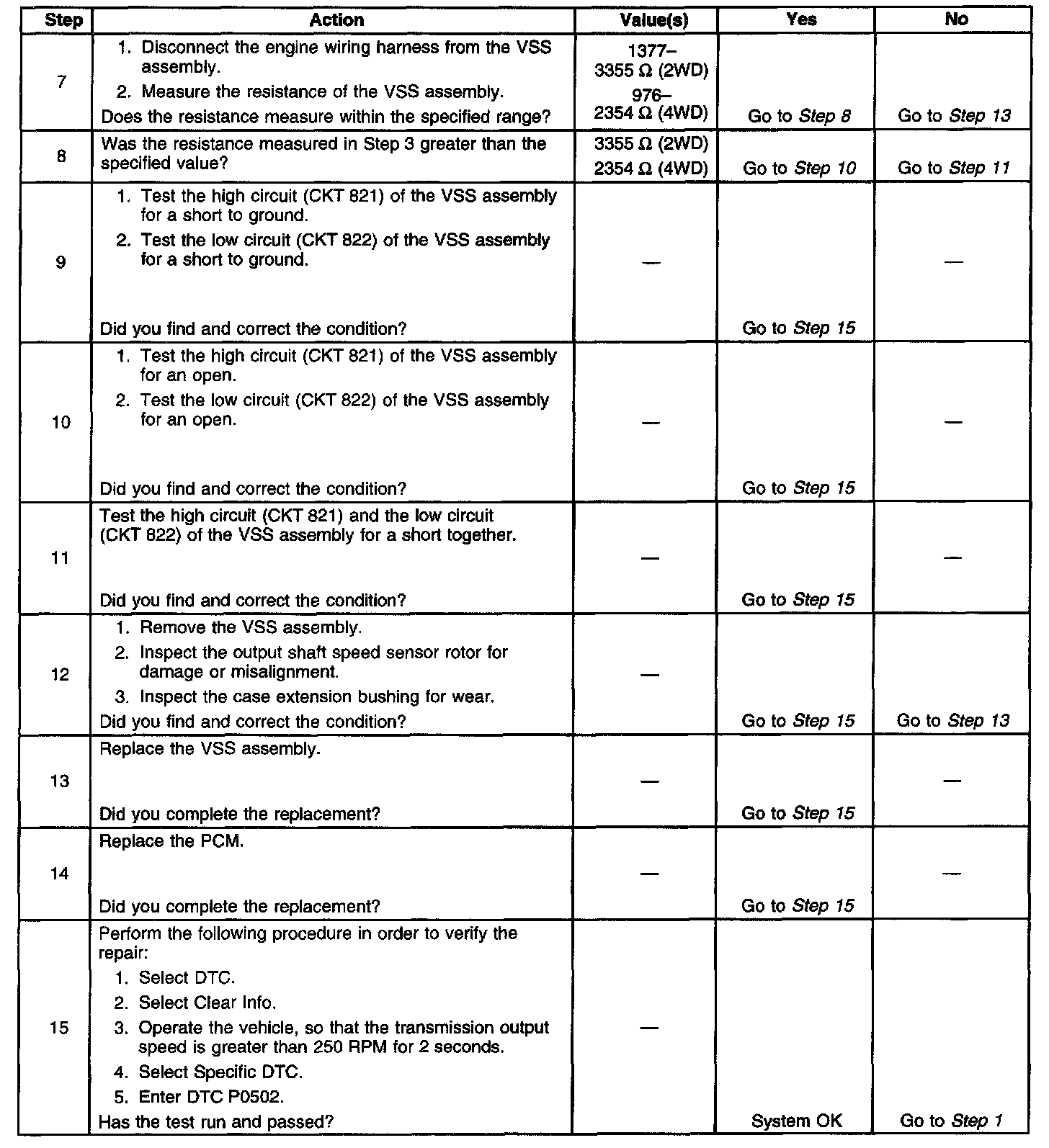 When the PCM detects a low vehicle speed when there is a high engine speed in a drive gear range, then DTC P0502 sets. DTC P0502 is a type B DTC.