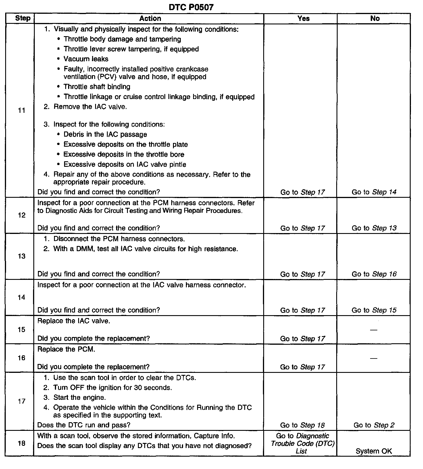 CIRCUIT DESCRIPTIONThe engine idle speed is controlled by the idle air control (IAC) valve. The IAC valve is on the throttle body. The IAC valve pintle moves in and out of an idle air passage bore to control air flow around the throttle plate. The valve consists of a movable pintle, driven by a gear attached to a two phase bi-polar permanent magnet electric motor called a stepper motor. The stepper motor is capable of highly accurate rotation, or of movement, called steps. The stepper motor has two separate windings that are called coils. Each coil is fed by two circuits from the powertrain control module (PCM). When the PCM changes polarity of a coil, the stepper motor moves one step. The PCM uses a predetermined number of counts to determine the IAC pintle position. Observe IAC counts with a scan tool. The IAC counts will increment up or down as the PCM attempts to change the IAC valve pintle position. An IAC Reset will occur when the ignition key is turned OFF. First, the PCM will seat the IAC pintle in the idle air passage bore. Second, the PCM will retract the pintle a predetermined number of counts to allow for efficient engine start-up. If the engine idle speed is out of range for a calibrated period of lime, an idle speed diagnostic trouble code (DTC) may set.