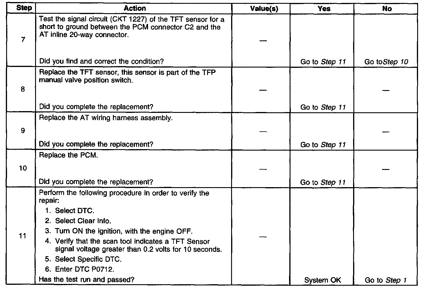 When the PCM detects a continuous short to ground in the TFT signal circuit or in the TFT sensor, then DTC P0712 sets. DTC P0712 is a type C DTC.