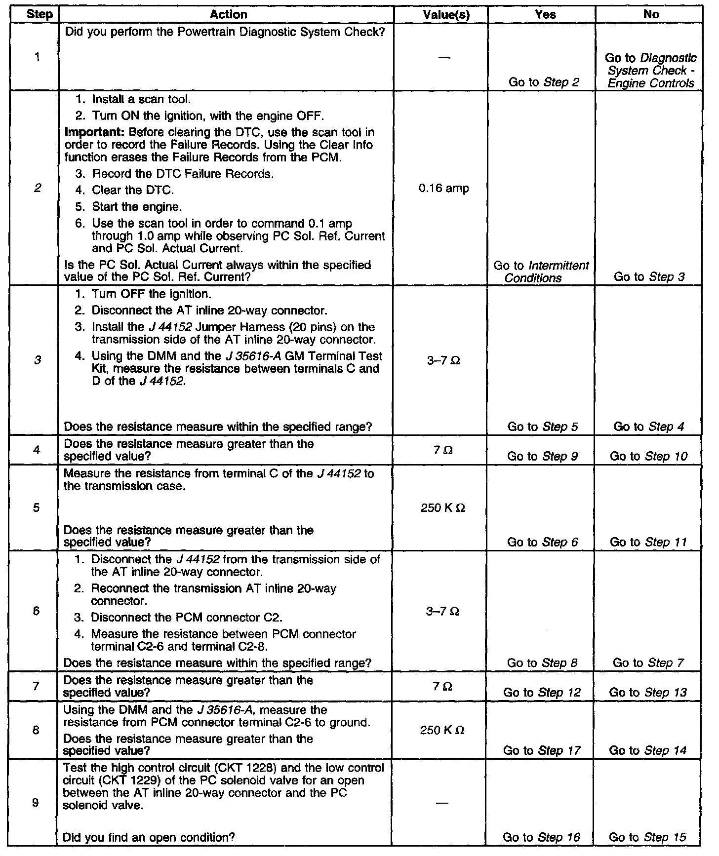3. This step tests the PC solenoid valve and Automatic Transmission (AT) wiring harness assembly for incorrect resistance.