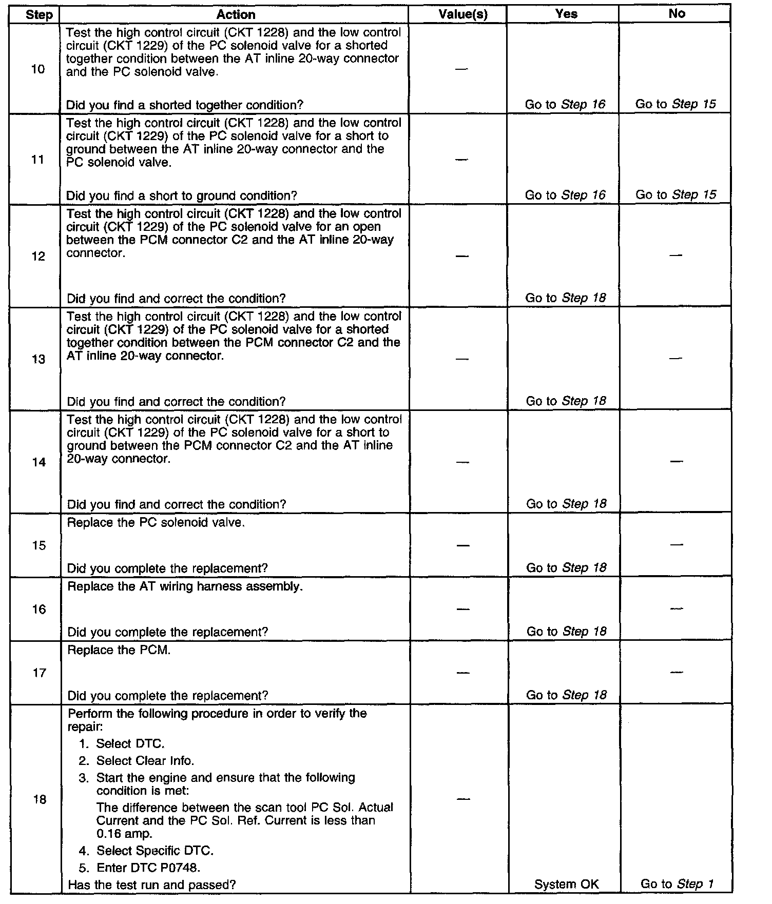 When the PCM detects a continuous open or short in the PC solenoid valve circuit, then DTC P0748 sets. DTC P0748 is a type C DTC.