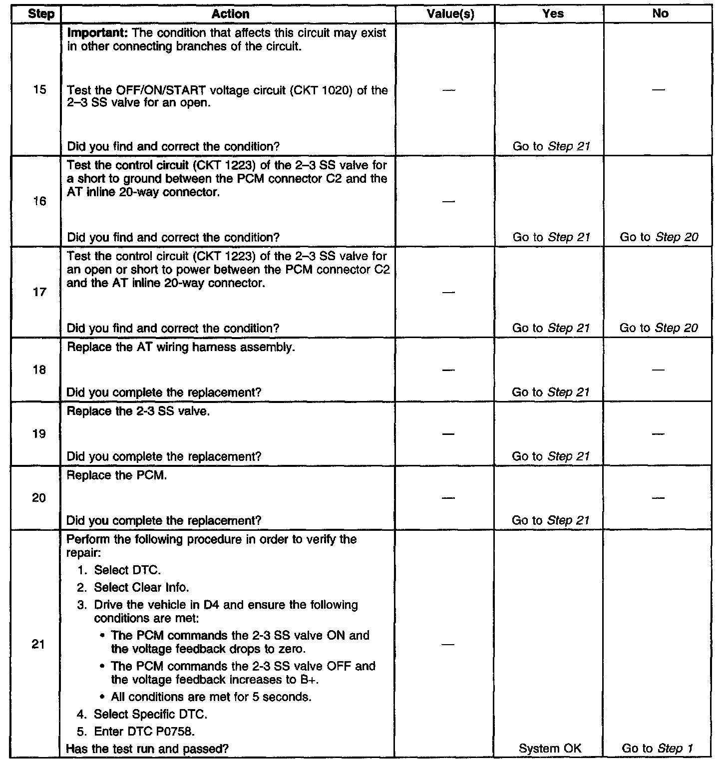 4. This step tests the function of the 2-3 SS valve and the Automatic Transmission (AT) wiring harness assembly.