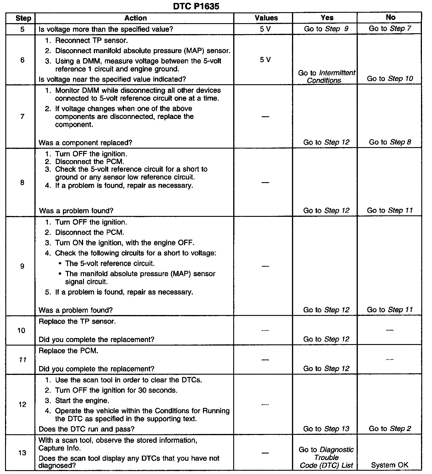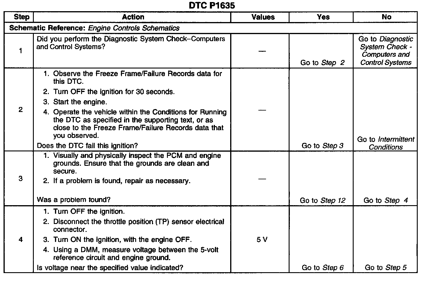 The powertrain control module (PCM) monitors the voltage on the 5-volt reference 1 circuit. If the voltage is out of tolerance, the PCM will set DTC P1635.