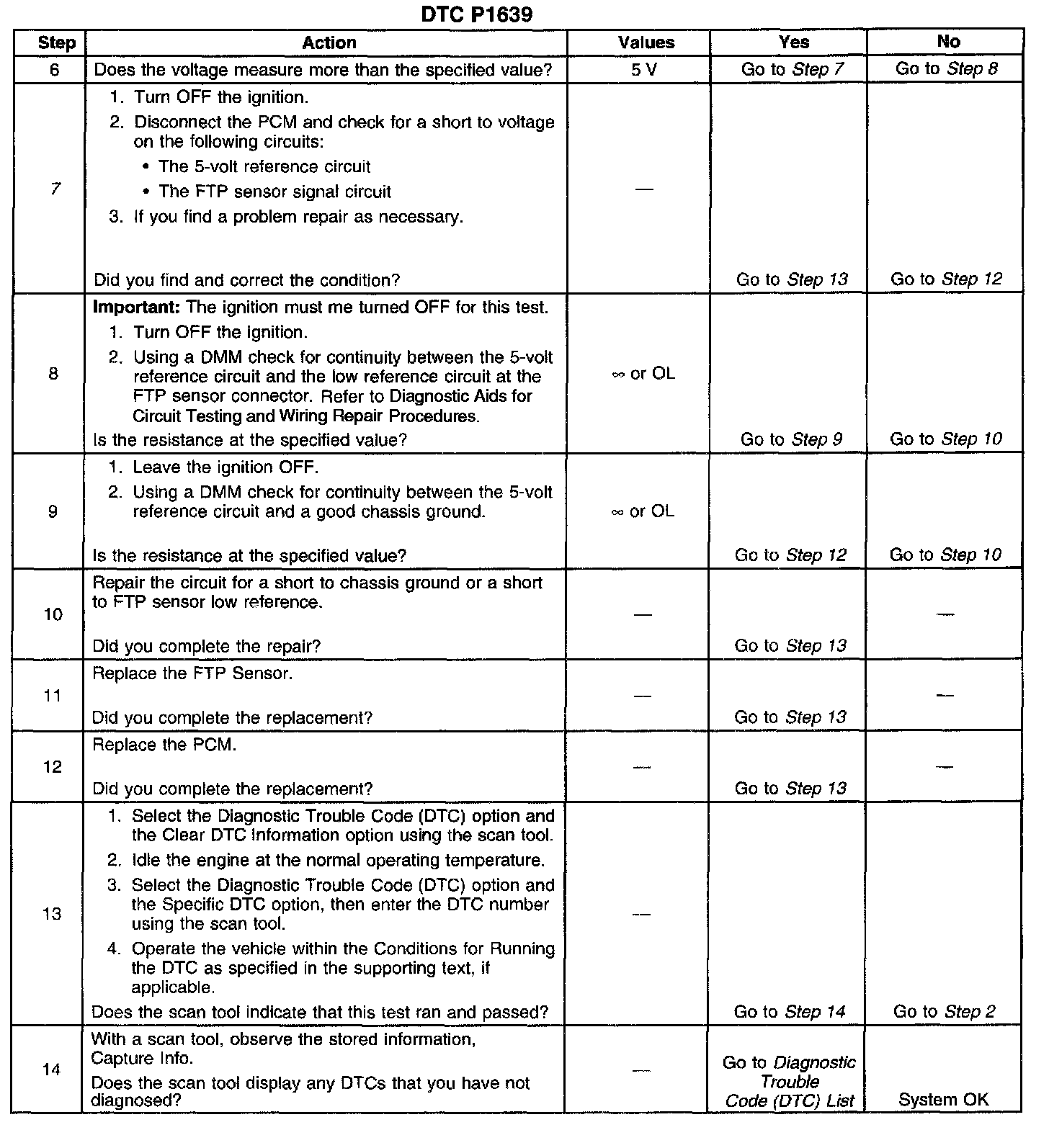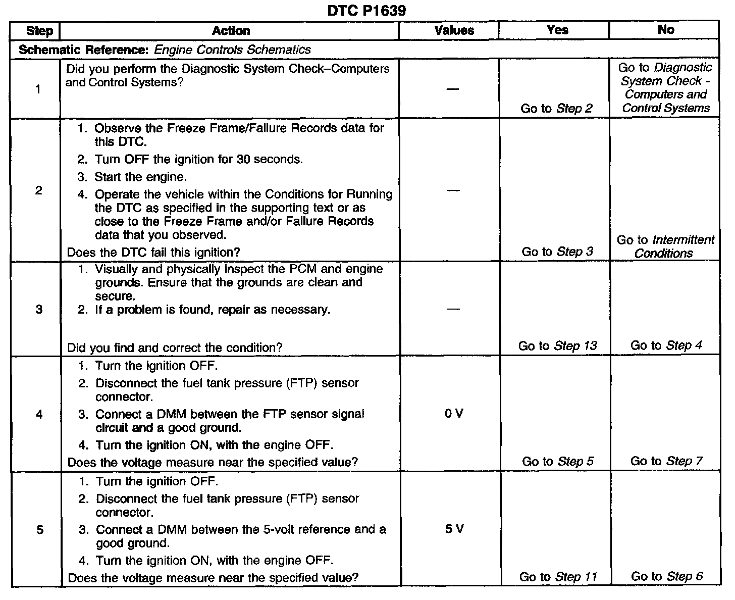 CIRCUIT DESCRIPTIONThe powertrain control module (PCM) uses the 5-volt reference 2 circuit as a sensor feed for the fuel tank pressure (FTP) sensor. The PCM monitors the voltage on the 5-volt reference 2 circuit. If the voltage is out of tolerance, the PCM will set DTC P1639.