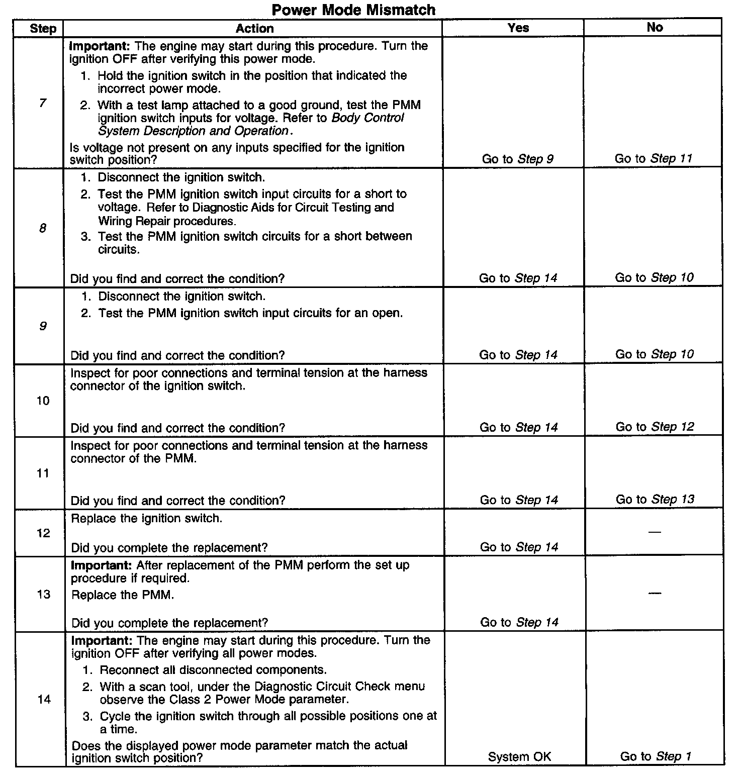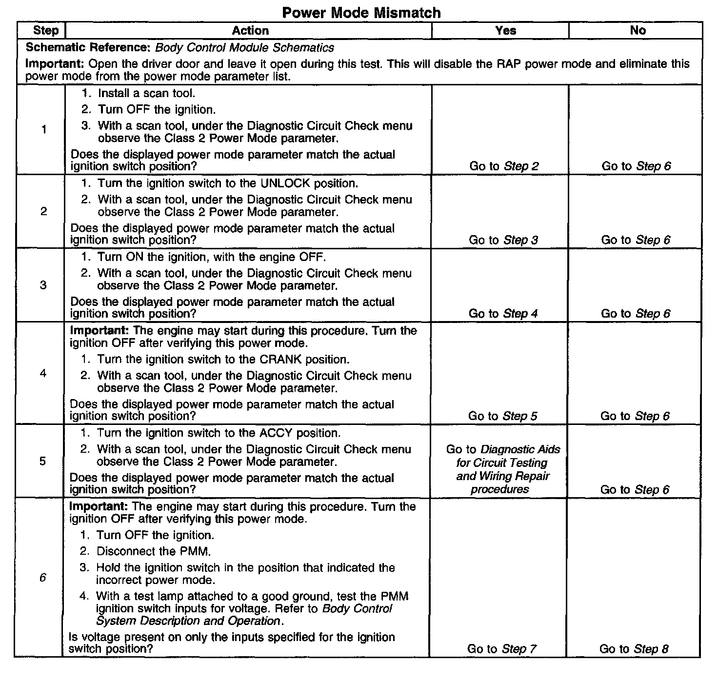 CIRCUIT DESCRIPTIONNormal vehicle class 2 communications and module operations will not begin until the system power mode has been identified. Discrete wires from the ignition switch contacts are monitored by the power mode master (PMM) module in order to determine the correct power mode. The PMM communicates the system power mode to all class 2 modules on the class 2 serial data line. Refer to Body Control System Description and Operation to identify which module is the PMM and the applicable power mode look up table.