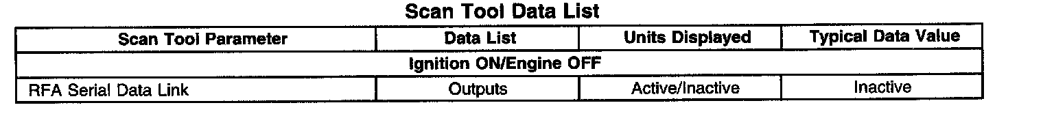 The keyless Entry Scan Tool Data List contains all of the keyless entry related parameters that are available on the scan tool. The parameters in the list are arranged in alphabetical order. The column, "Data List," indicates the location of the parameter within the scan tool menu selections. Use the Keyless Entry Scan Tool Data List as directed by a diagnostic table or in order to supplement the diagnostic procedures. Begin all of the diagnostic procedures with Diagnostic System Check - Remote Keyless Entry