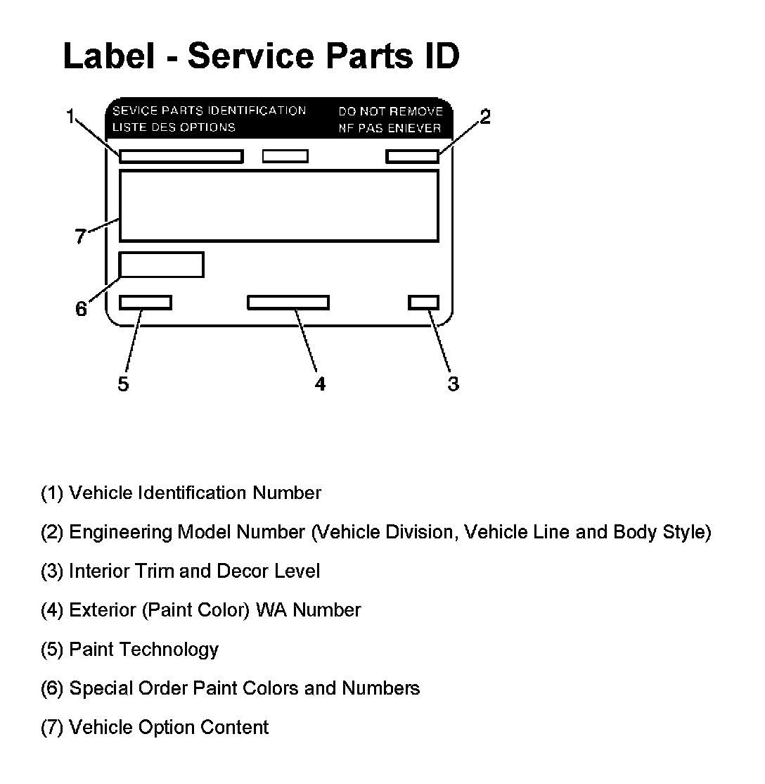 The Service Parts Identification Label aids the service personnel in identifying the parts and options originally installed on the vehicle. The label is located on the front passenger door frame.