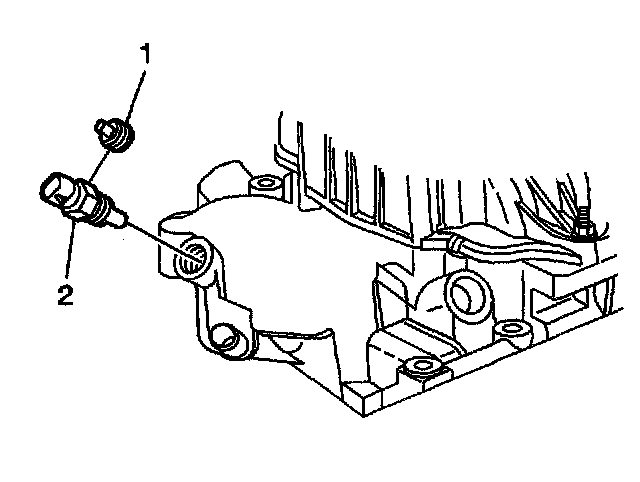 27. If reusing the Engine Coolant Temperature (ECT) sensor plug (1) or the ECT sensor (2), if equipped, apply sealant GM P/N United States 12346004, GM P/N Canada 10953480, or equivalent, to the threads of the ECT sensor plug (1) or the ECT sensor (2).