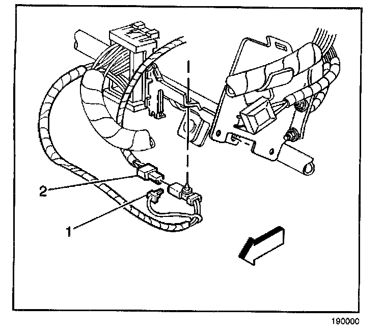 5. Disconnect the inflatable restraint steering wheel module connector (2) located next to the steering column.