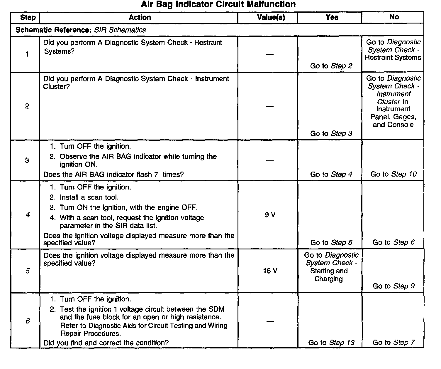^ If Ignition 1 voltage is outside of the normal operating voltage range (9-16 volts), the AIR BAG indicator will come ON solid with no DTCs set.