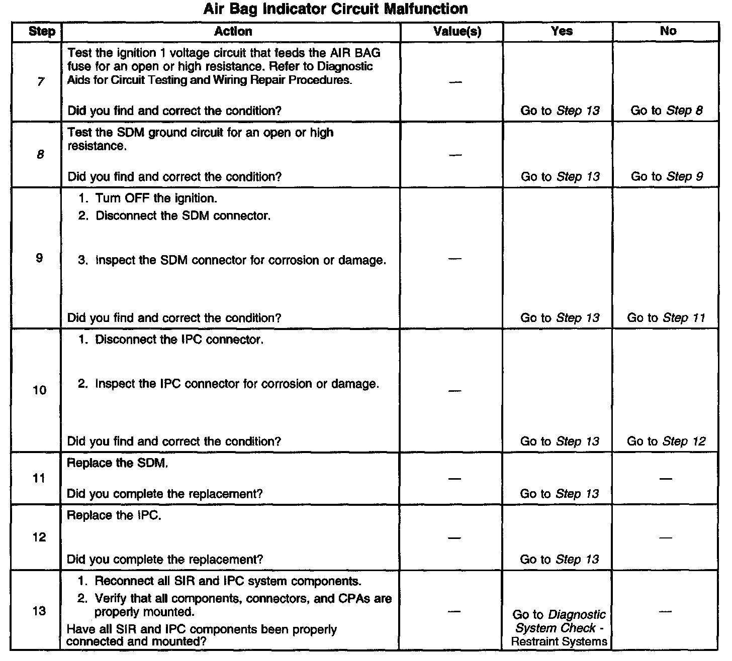 ^ The loss of serial data communication between the SDM and the instrument panel cluster (IPC) will cause the AIR BAG indicator to come ON solid. Refer to DTC U1001-U1254 in Data Link Communications.
