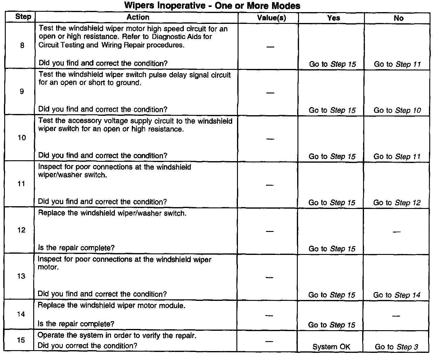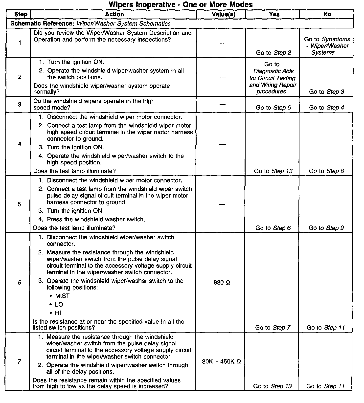 7. This step tests for continuity through the delay resistors in the windshield wiper/washer switch. The measured resistance will change in sequence from high to low as the delay speed is increased. The connector behind the instrument panel knee bolster is suitable for performing this step.