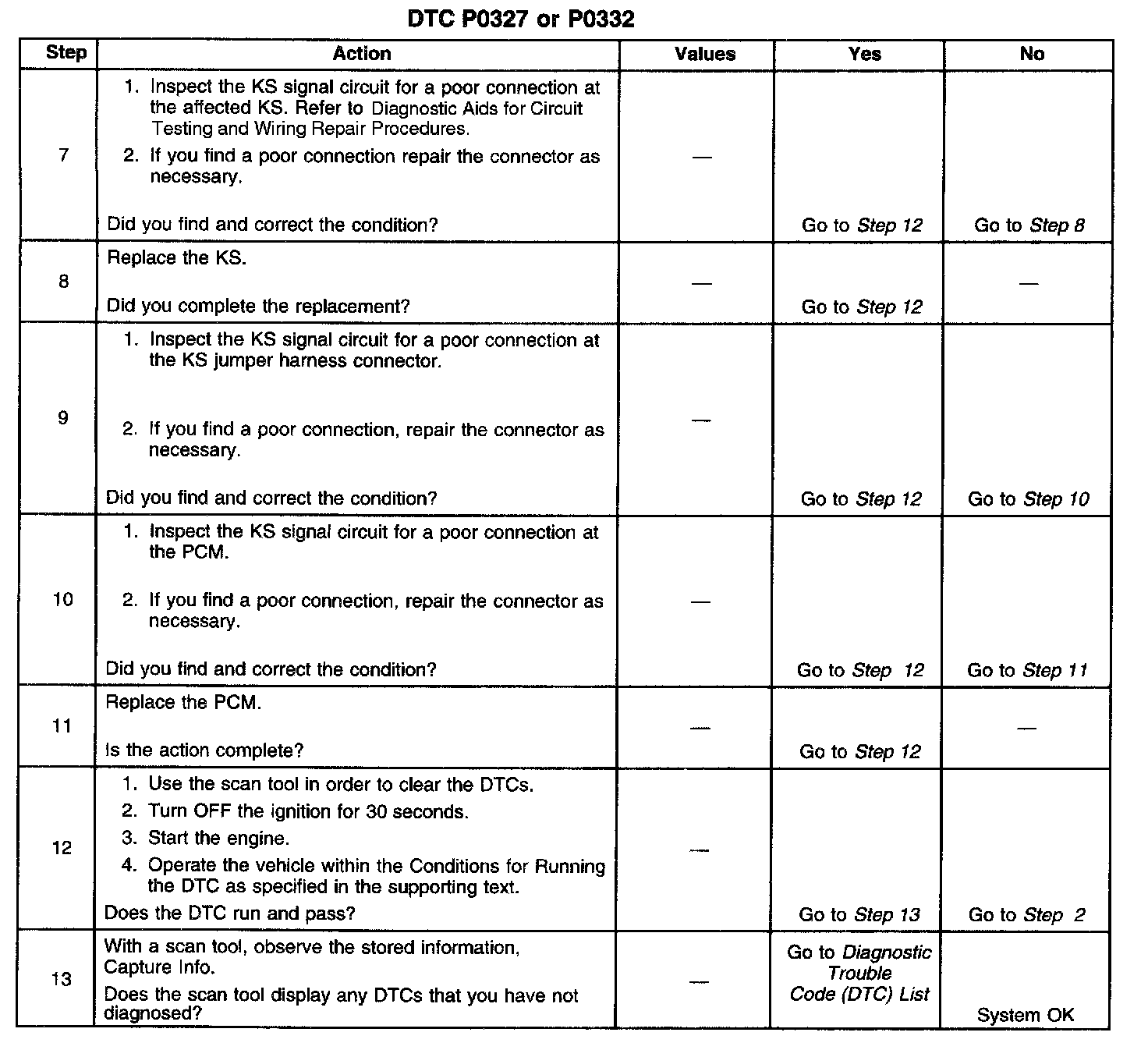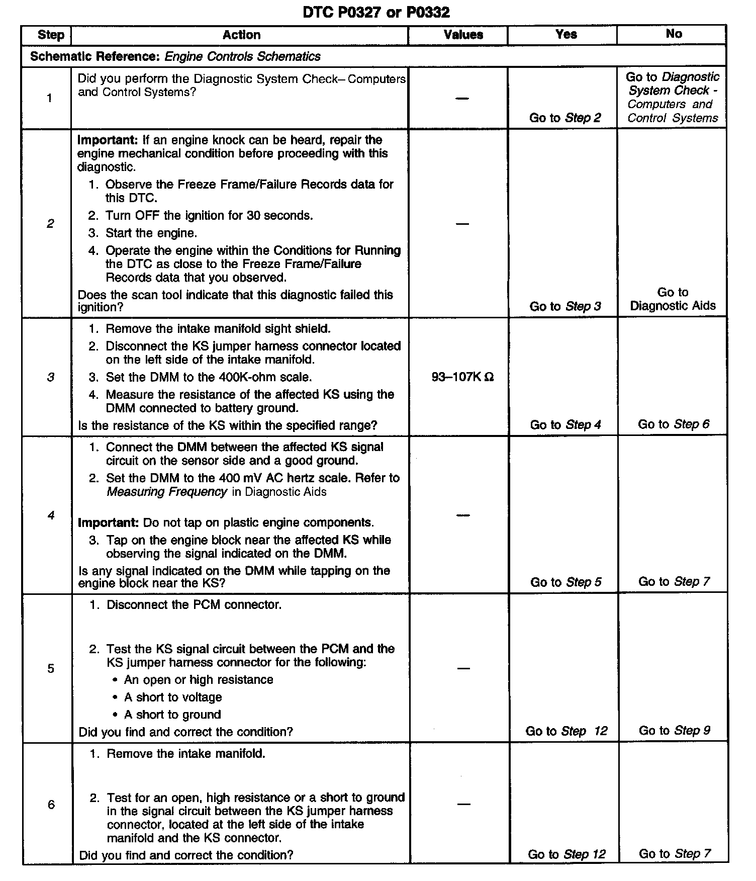 ^ If DTCs P0327 and P0332 are set at the same time, inspect for poor connections at the KS harness jumper, located at the left rear side of the intake manifold.