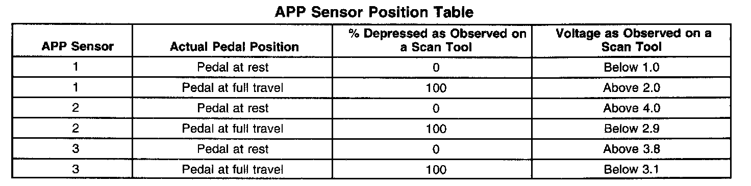 6. The APP sensor 3 has a dedicated 5-volt reference circuit. Monitoring the APP sensor 1 voltage aids in diagnosing the APP sensor 3 5-volt reference circuit. If the scan tool displays 5 volts then the circuits are OK.