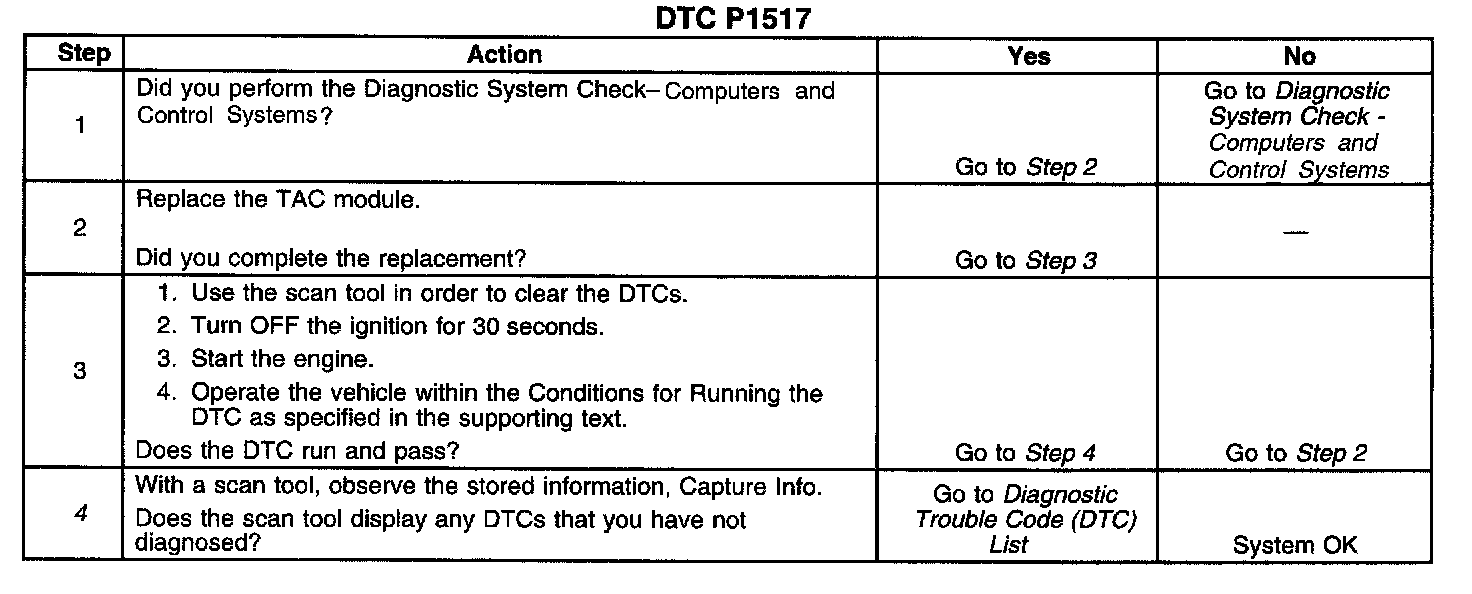 ^ When the TAC module detects a condition within the TAC system, more than 1 TAC system related DTC may set. This is due to the many redundant tests run continuously on this system. Locating and repairing an individual condition may correct more than 1 DTC. Disconnecting components during testing may set additional DTCs. Remember this if you review the stored information in Capture Info.