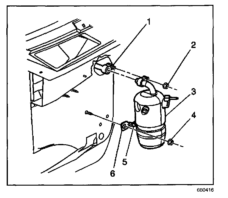 9. Remove the retaining bracket (6) from the accumulator.