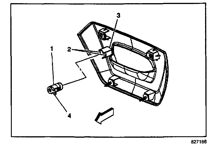 5. Install the handle bezel to end gate, making sure to line up the lock cylinder arm (4) with the opening in the handle. Refer to End Gate Adjustment in the Body Rear End sub-section of the Service Manual (SI 2000 SIO ID # 814623).