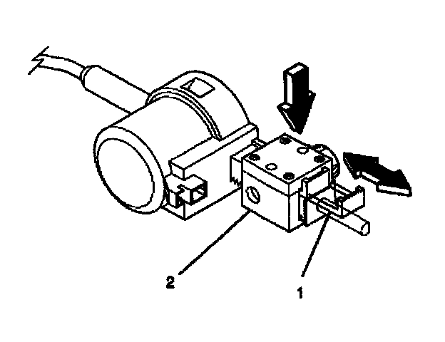 3.1. Pull out the tab (1) on the adjuster block side (2) of the automatic transmission shift lock control actuator.