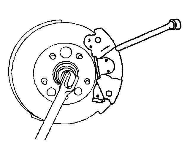 5. Insert a drift or a large screwdriver through the brake caliper into 1 of the brake rotor vanes in order to prevent the wheel drive shaft from turning.