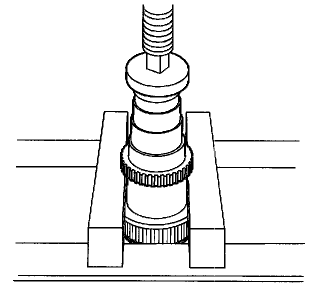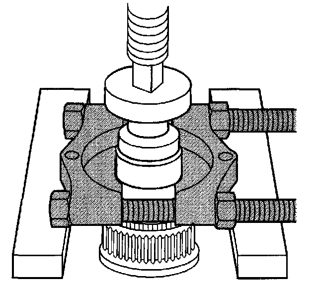 ^ Using a wrench on the forcing screw, remove the rear output shaft bushing.