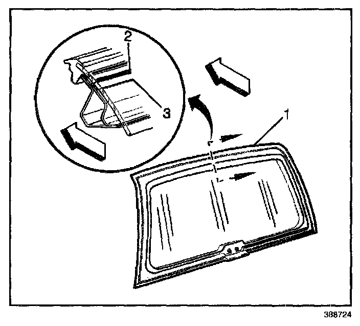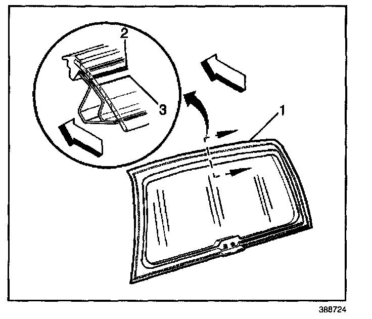 5. With the aid of an assistant remove the window (1) from the closed liftgate. Remove the C-clips from the liftgate window hinges, NOT from the liftgate.