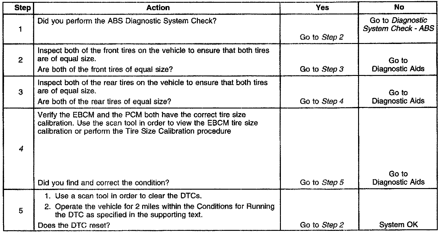 The EBCM detects that one wheel speed input is 10 percent greater than or 10 percent less than the other wheel speed inputs within 3.2 km (2 miles) of driving.