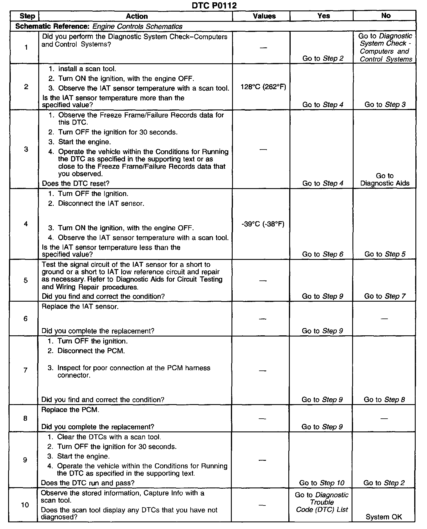 CIRCUIT DESCRIPTIONThe intake air temperature (IAT) sensor is a variable resistor, sometimes called a thermistor. The IAT sensor has a signal circuit and a low reference circuit. The IAT sensor measures the temperature of the air entering the engine. The powertrain control module (PCM) supplies 5 volts to the IAT signal circuit. When the IAT sensor is cold, the sensor resistance is high. When the air temperature increases, the sensor resistance lowers. With high sensor resistance, the PCM detects a high voltage on the IAT signal circuit. With lower sensor resistance, the PCM detects a lower voltage on the IAT signal circuit. If the PCM detects an excessively low IAT signal voltage, indicating a high temperature, DTC P0112 sets.