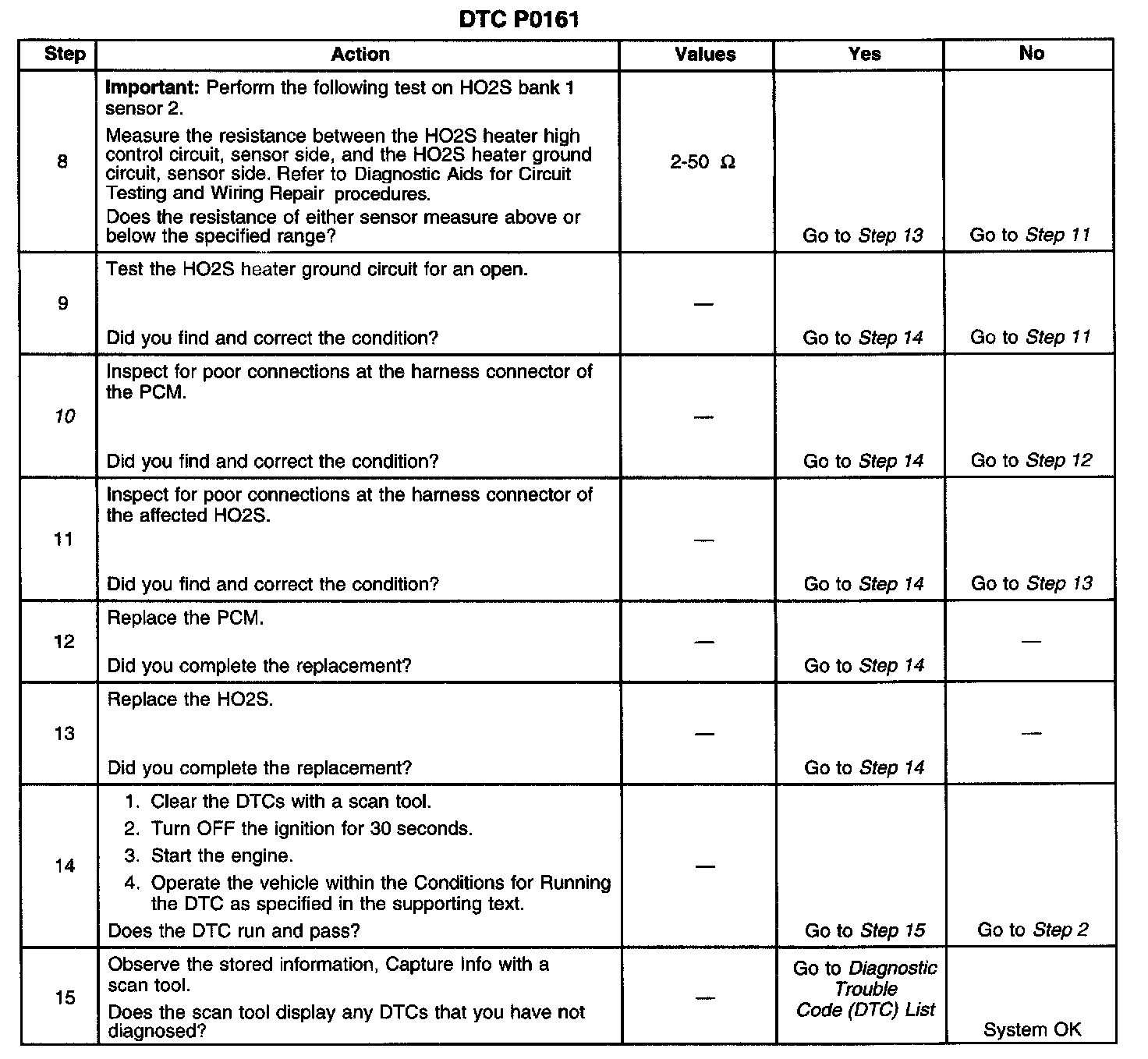 The numbers below refer to the step numbers on the diagnostic table.