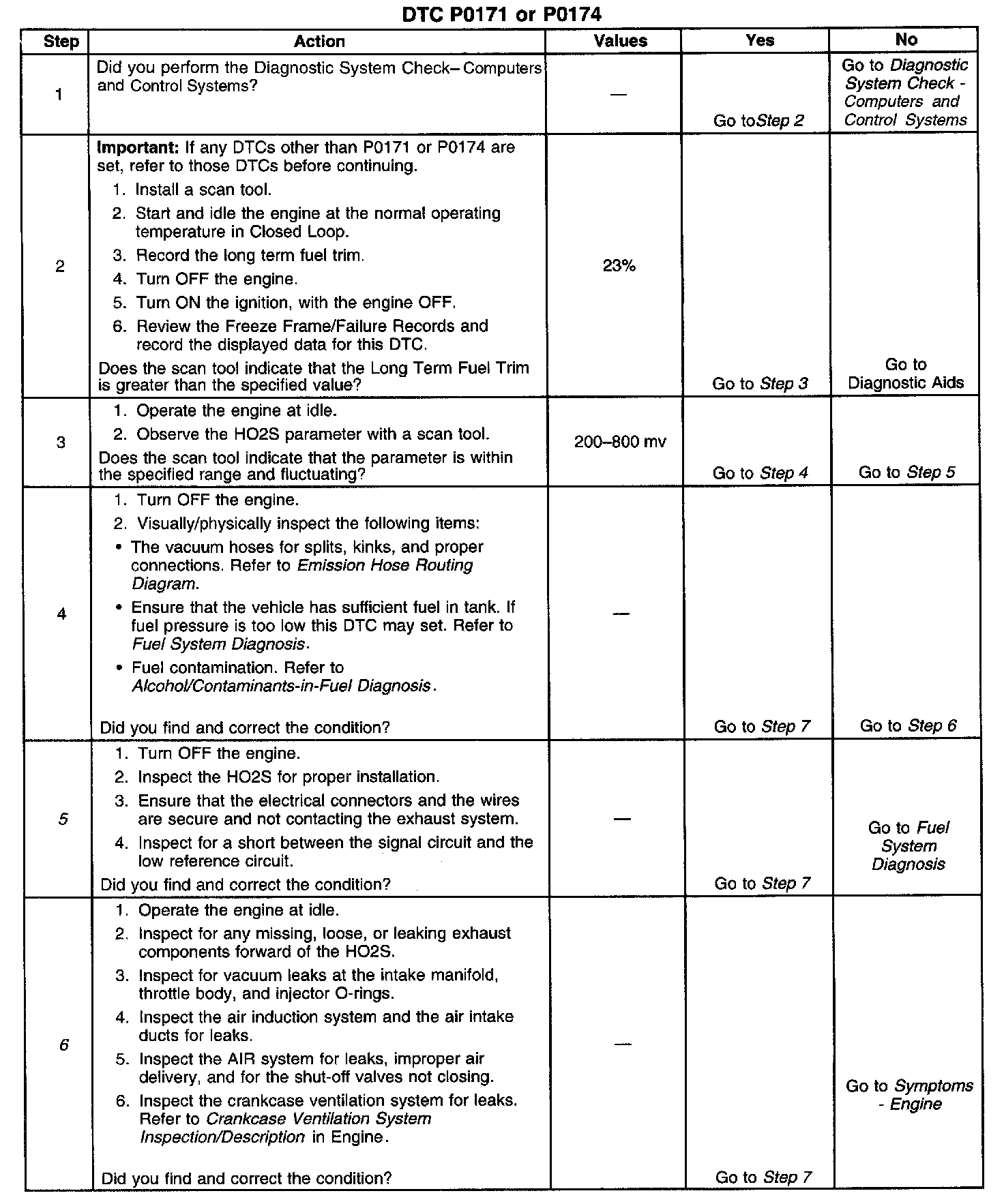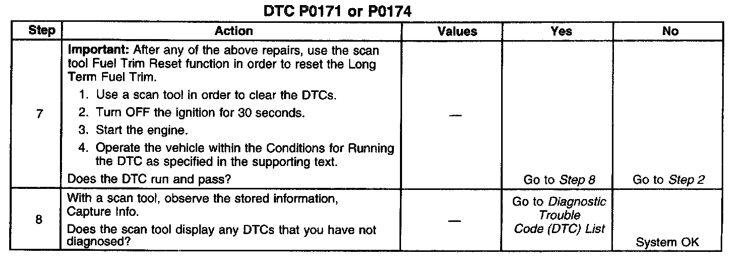 CIRCUIT DESCRIPTIONThe powertrain control module (PCM) controls the air/fuel metering system in order to provide the best possible combination of driveability, fuel economy, and emission control. Fuel delivery is controlled differently during Open and Closed Loop. During open loop, the PCM determines fuel delivery based on sensor signals without oxygen sensor input. During Closed Loop, the oxygen sensor inputs are added and used by the PCM to calculate short and long term fuel trim fuel delivery adjustments. If the oxygen sensors indicate a lean condition, fuel trim values will be above 0 percent. If the oxygen sensors indicate a rich condition, fuel trim values will be below 0 percent. Short term fuel trim values change rapidly in response to the heated oxygen sensor (HO2S) voltage signals. Long term fuel trim makes coarse adjustments in order to maintain an air/fuel ratio of 14.7:1. If the PCM detects an excessively lean condition, this DTC will set.