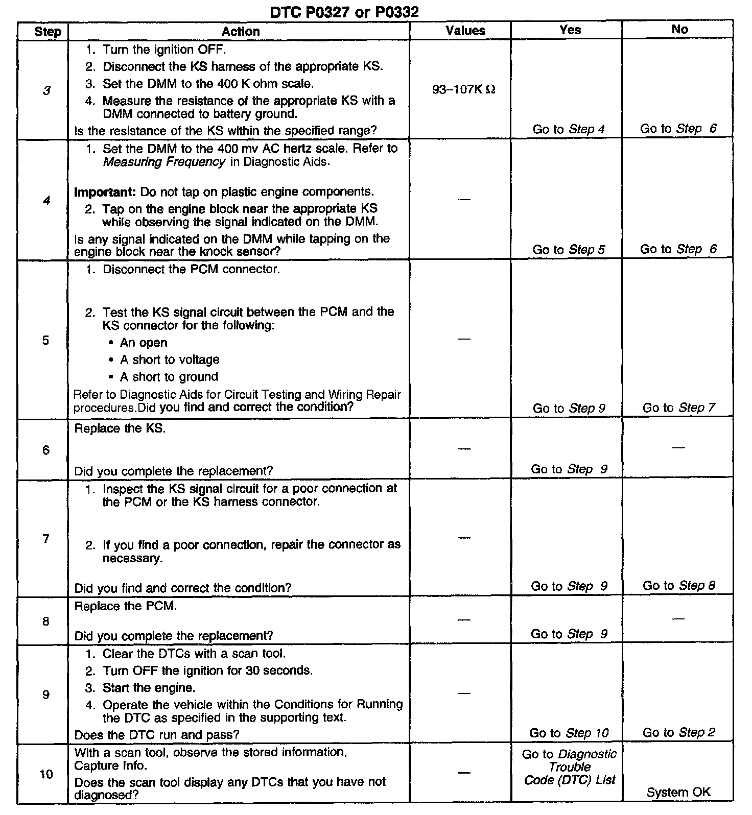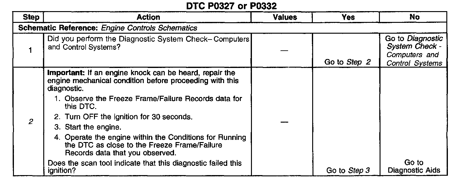 CIRCUIT DESCRIPTIONThe knock sensors (KS) produce an IAC signal when specific frequencies are detected. When the engine operates, the powertrain control module (PCM) learns a minimum and maximum frequency of noise of normal engine operation. The KS system monitors both knock sensors in order to determine if knock is present. If the KS system determines that excessive knock is present, the PCM retards the spark timing based on the signals from the KS system. The PCM then retards the timing until no knock is present. When the PCM detects a frequency that is less than or more than a defined range, DTC P0327 will set for a failure in KS 1 which is located on bank 1 on the drivers side of the engine or DTC P0332 will set for a failure in KS 2 which is located on bank 2 on the passenger side of the engine.