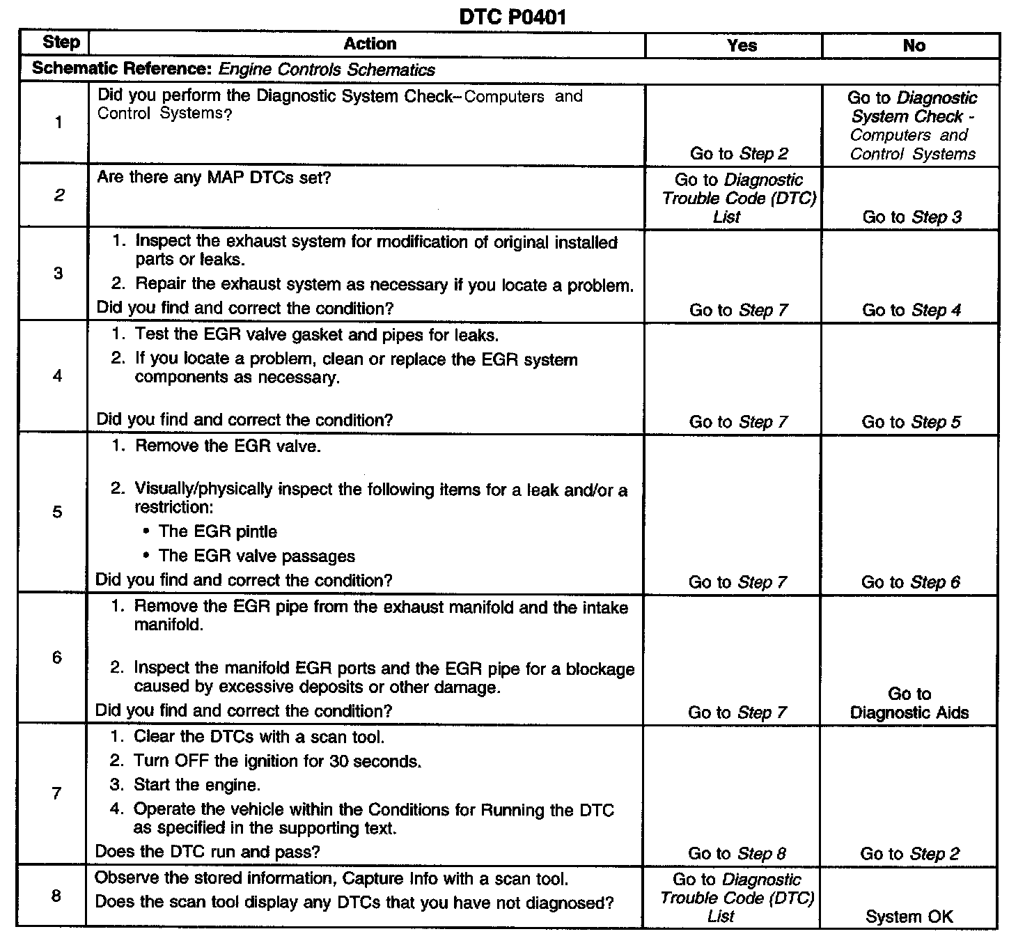 CIRCUIT DESCRIPTIONThe powertrain control module (PCM) tests the exhaust gas recirculation (EGR) system during deceleration by momentarily commanding the EGR valve open. The pressure in the intake manifold increases when the EGR valve is open. The PCM monitors the manifold absolute pressure (MAP) sensor signal during the EGR system diagnostic in order to determine the amount of EGR flow. The PCM calculates an error based on the difference between the actual MAP increase and a predetermined value. The PCM records the error and adjusts an internal fail counter towards the fail threshold if the error is too great. The PCM sets a DTC P0401 when the fail counter exceeds the fail threshold. The number of test samples required to exceed the fail threshold varies according to the magnitude of the detected flow errors.