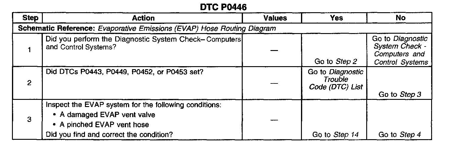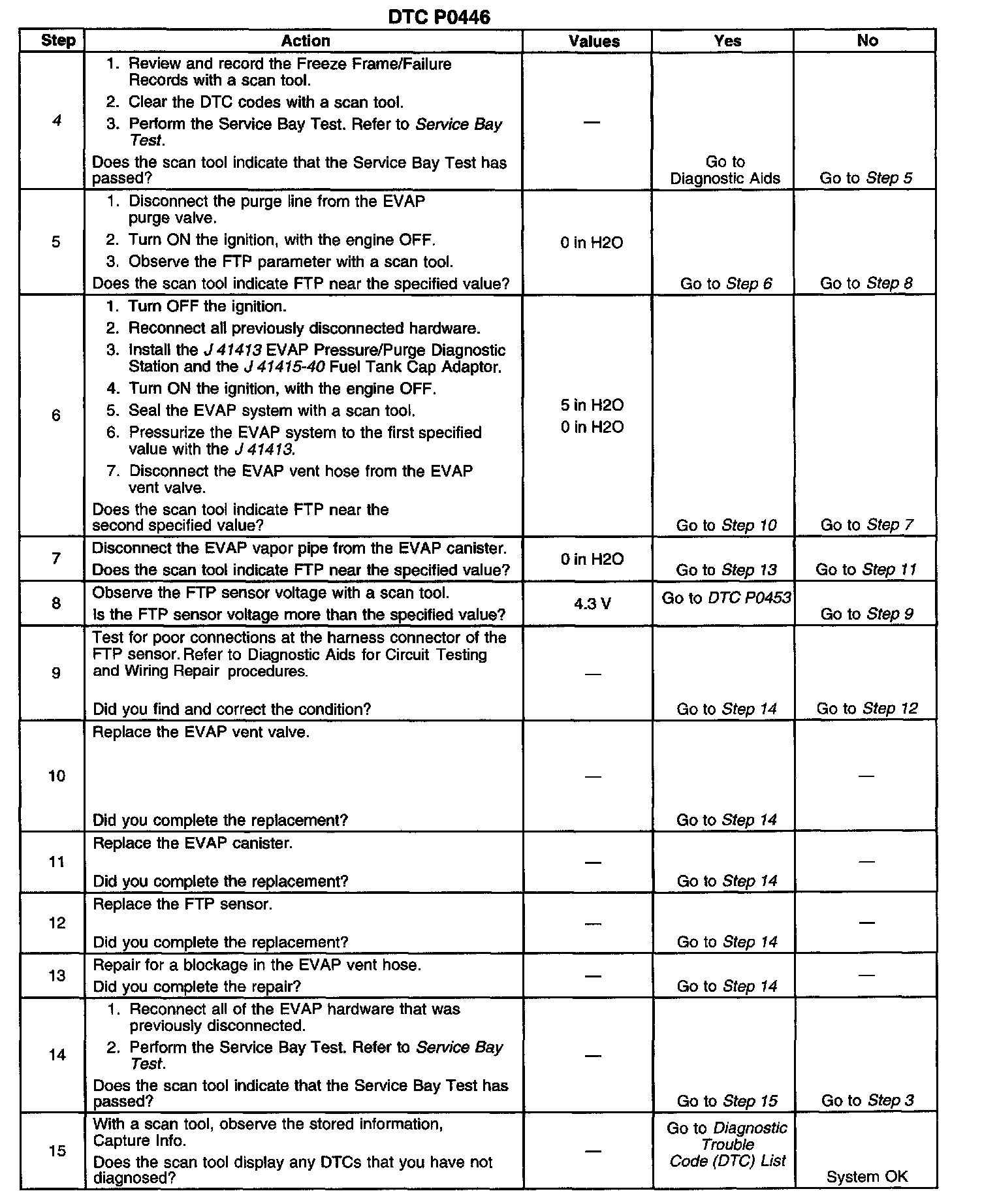 DESCRIPTIONA restricted or blocked evaporative emission (EVAP) vent path is detected by the control module monitoring the fuel tank pressure (FTP) during normal operation. The control module commands the EVAP vent valve OFF, or open, and the EVAP canister purge valve ON, or open. The FTP should remain low as vacuum is drawn on the EVAP system. If the vent path is blocked or restricted, the vacuum level will increase and DTC P0446 will set.