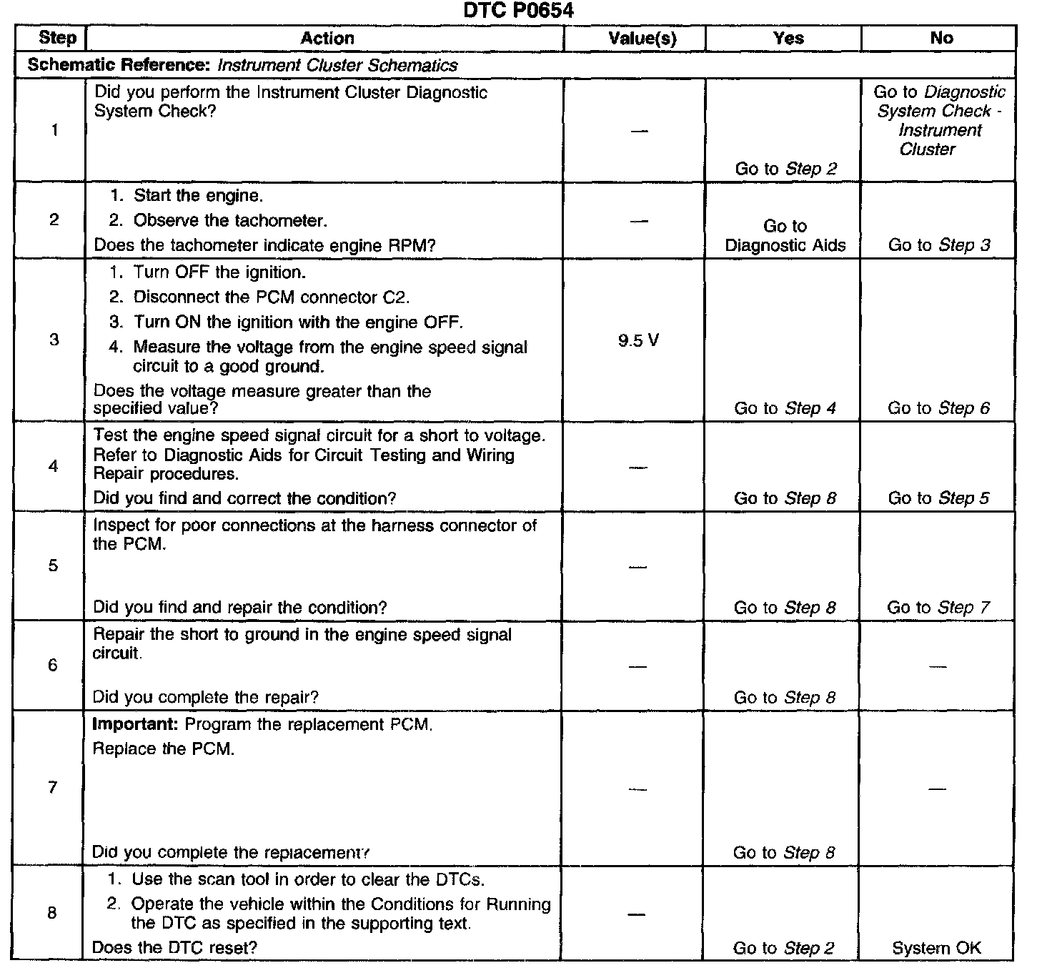 CIRCUIT DESCRIPTIONThe PCM creates the engine speed output signal by pulsing the circuit to ground at a predetermined hertz rate. The PCM pulses the circuit at the same rate as the engine speed signal input. The PCM monitors the voltage on the engine speed output circuit. If the PCM determines the voltage is out of the normal operating range, a DTC sets.