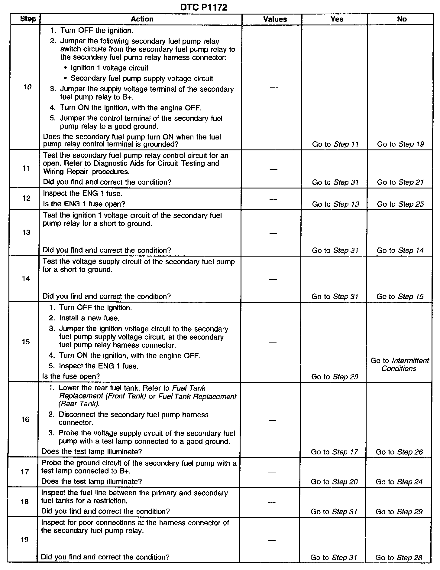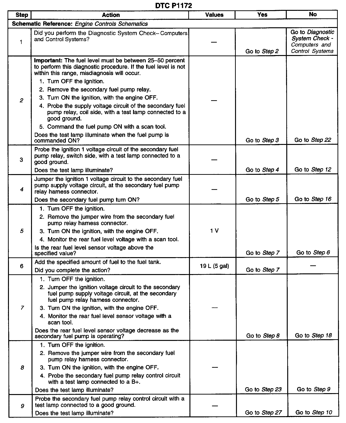 9. This step tests for a short to voltage on the control circuit of the secondary fuel pump relay. If the test lamp illuminates, a short to voltage is indicated.