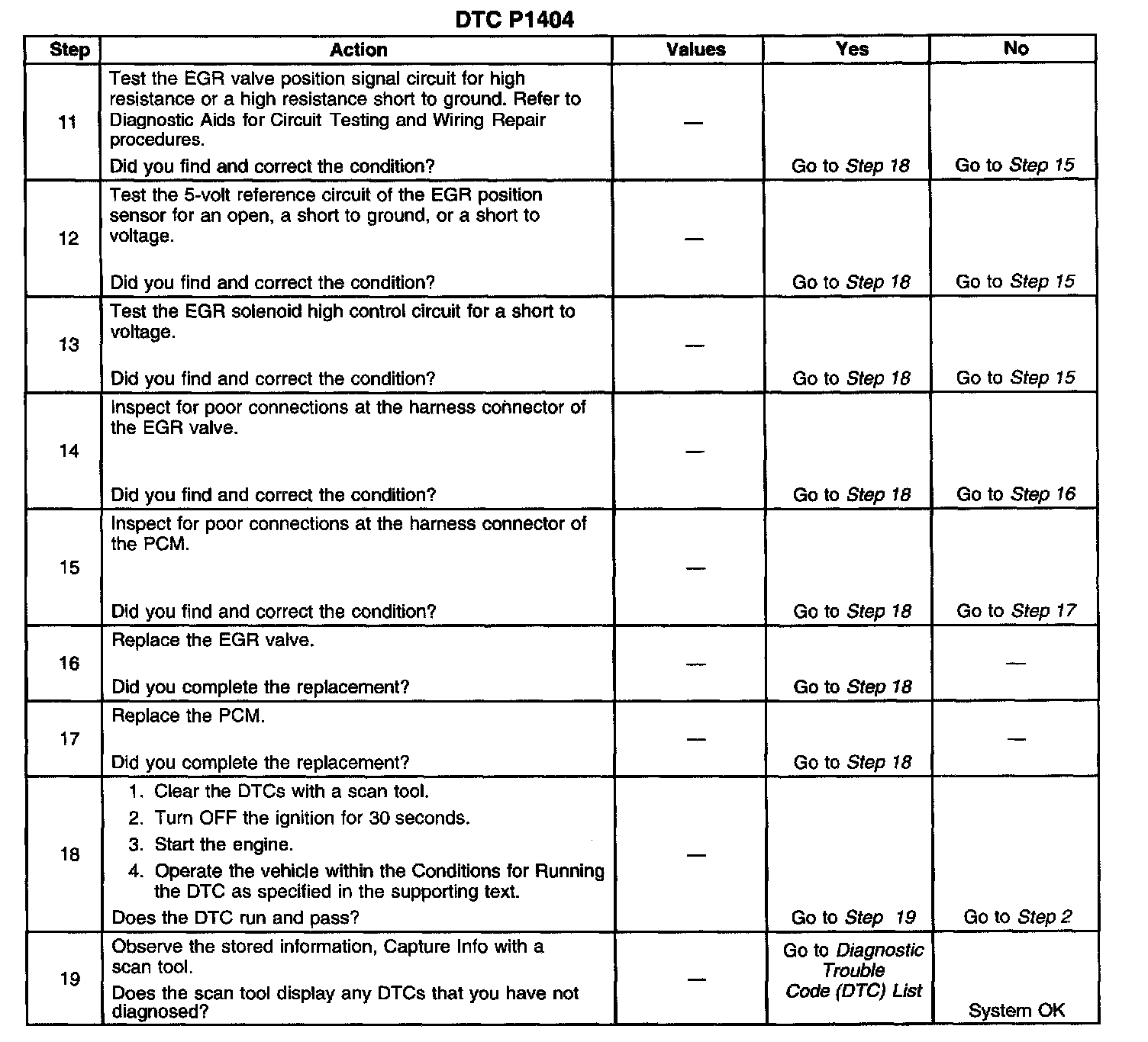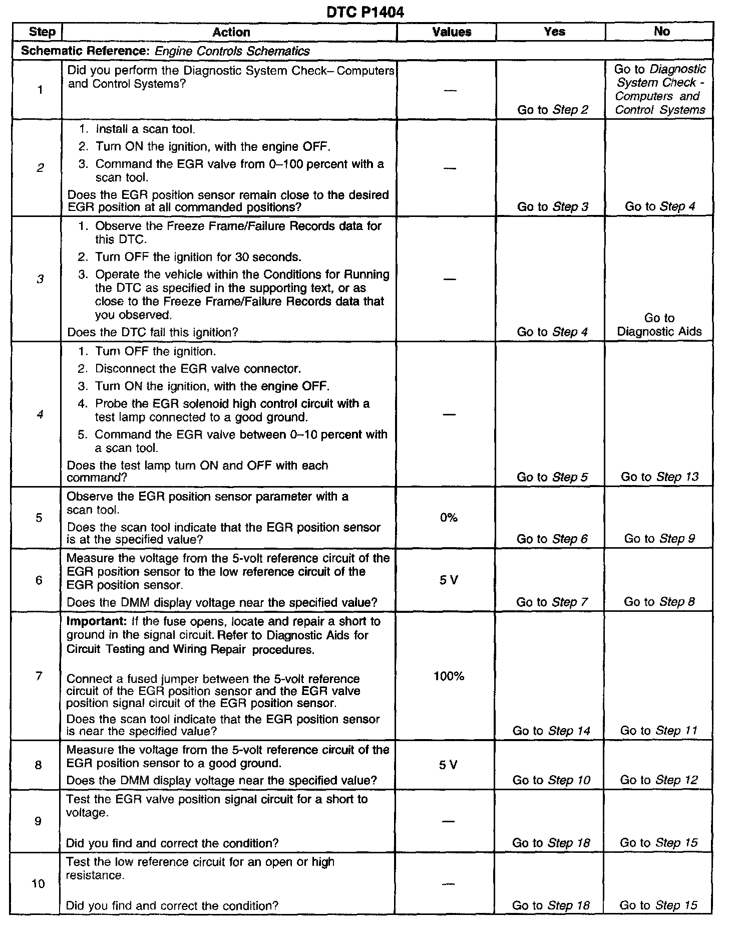 3. If DTC P1404 will only set under certain conditions, the malfunction may be intermittent. Refer to Diagnostic Aids. If an intermittent wiring problem is not present, test for a faulty connection at the PCM or the EGR valve. If the connections are OK and DTC P1404 continues to set, replace the EGR valve.