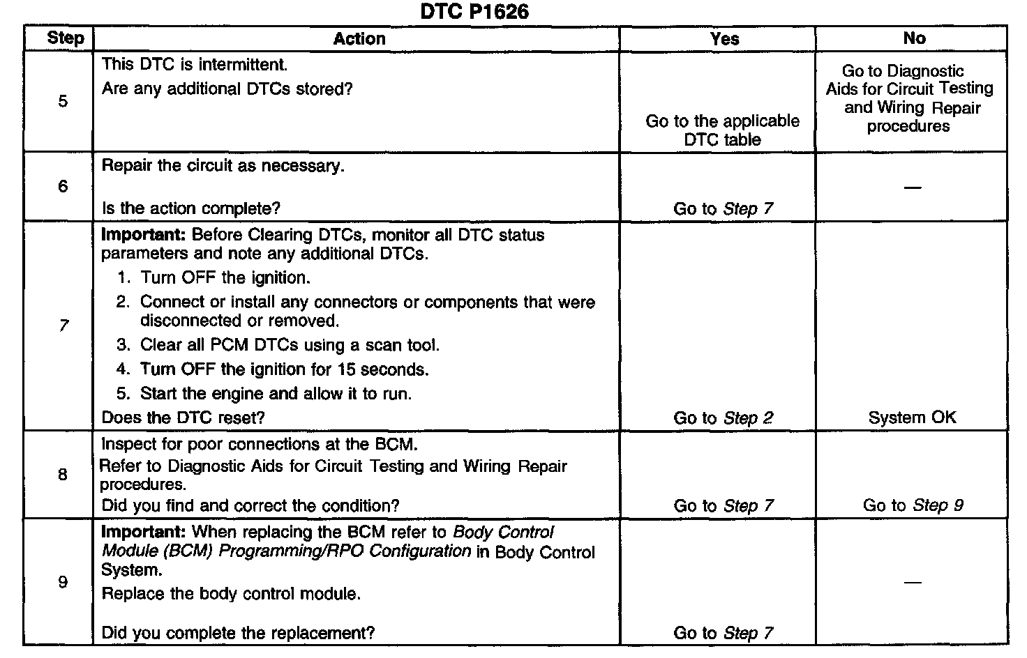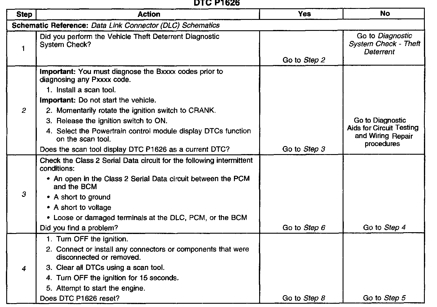 ^ If the Class 2 Serial Data circuit is shorted to ground or shorted to voltage, then all systems connected to the serial data circuit will not be able to communicate properly. Systems capable of storing loss of communications DTCs, or the DTCs with the letter "U" as a prefix, will have these codes stored in their memory. If a DTC U1192 is stored in the PCM memory along with the P1626, then a fault occurred at some point after the PCM received the correct password. The BCM must also be checked for intermittent operation due to a loss of power or ground to the module itself. After repairing the cause of DTC 1626, clear all DTCs from the systems capable of storing this DTC and DTC U1192.