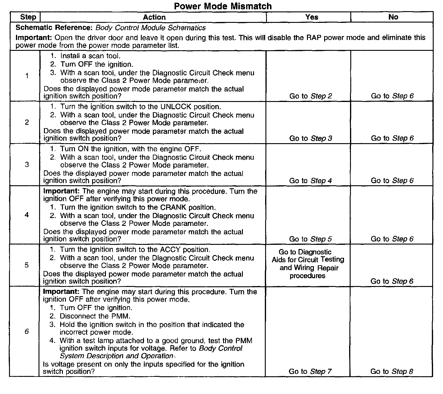 CIRCUIT DESCRIPTIONNormal vehicle class 2 communications and module operations will not begin until the system power mode has been identified. Discrete wires from the ignition switch contacts are monitored by the power mode master (PMM) module in order to determine the correct power mode. The PMM communicates the system power mode to all class 2 modules on the class 2 serial data line. Refer to Body Control System Description and Operation to identify which module is the PMM and the applicable power mode look up table.