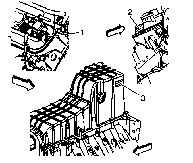 Engine IdentificationThe engine identification number is located on three locations. There is a label on the front of the right rocker arm cover (1), the rear of the left rocker arm cover (2), and a label on the right side of the engine oil pan (3). The engine identification number is used to track and distinguish the engine prior to installation in a vehicle.