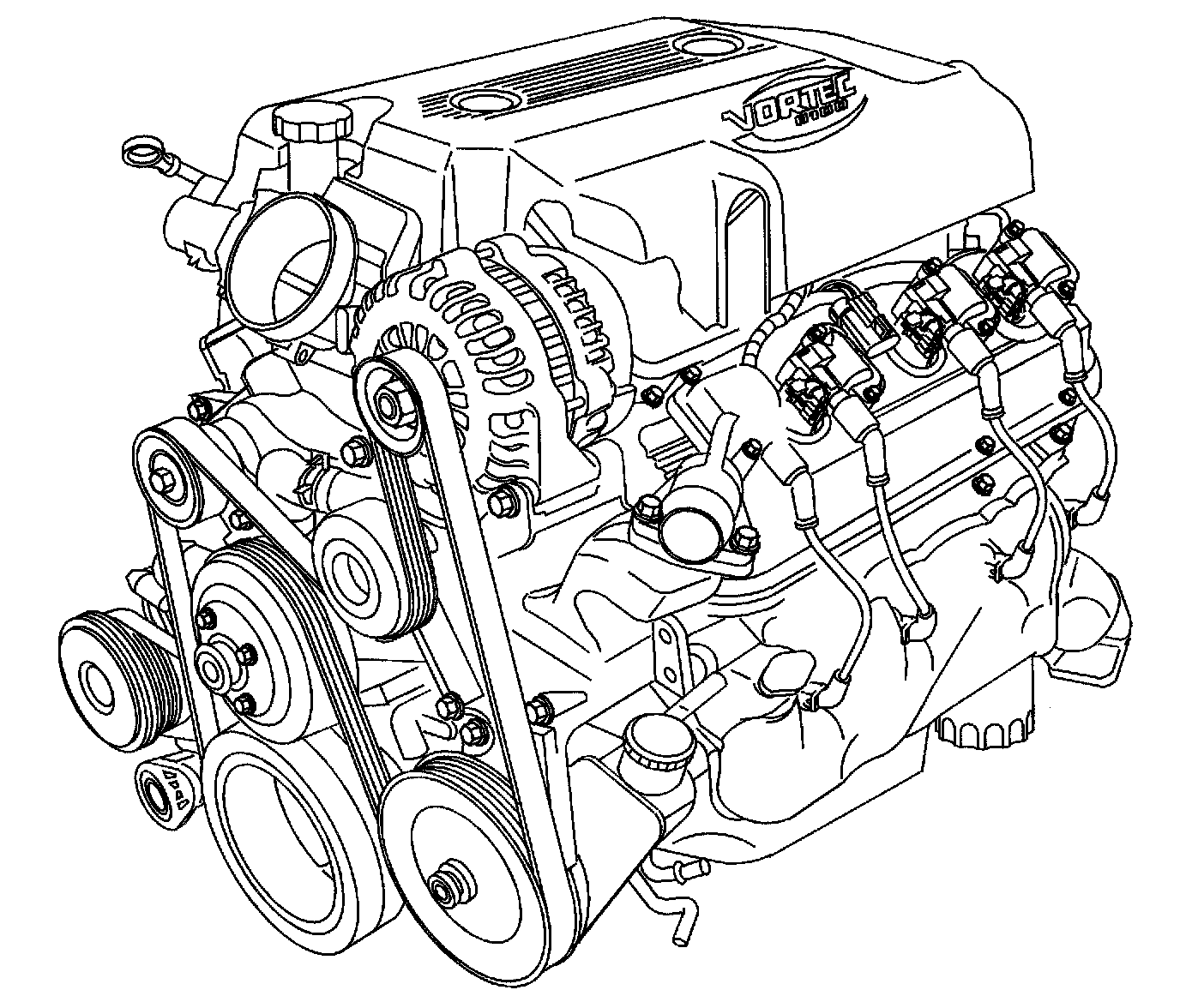 The intake manifold is a one-piece design. The intake manifold is made of cast aluminum, The throttle body is attached to the front of the intake manifold. A linear exhaust gas recirculation (EGR) port is cast into the manifold for exhaust gas recirculation mixture. The EGR valve bolts onto the rear of the intake manifold. The fuel rail assembly with eight separate fuel injectors is retained to the intake manifold by four studs. The fuel injectors are seated in their individual manifold bores with O-ring seals to provide sealing. A Manifold Absolute Pressure (MAP) sensor is mounted on the top of the intake manifold and sealed by an O-ring seal. The MAP sensor is held in place with a retainer bolt. The evaporative emission canister solenoid is located in the front of the intake manifold. The positive crankcase ventilation (PCV) system is internally cast into the intake manifold. There is not a PCV valve. A splash shield is installed under the intake manifold. The shield prevents hot oil from contacting the bottom of the intake manifold, maintaining air inlet charge density.