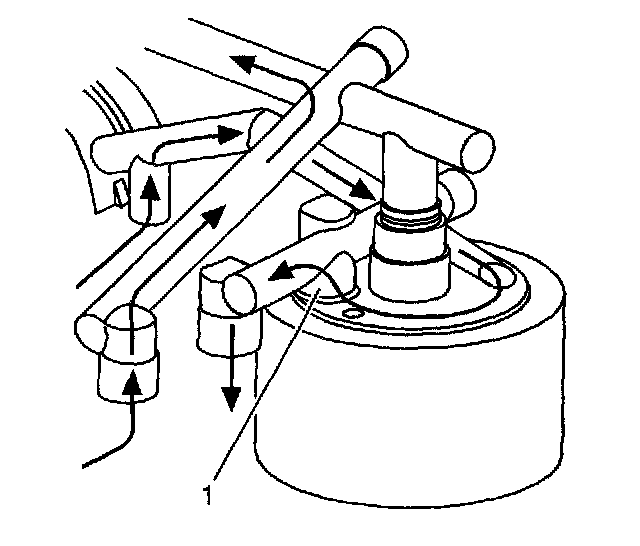 If the oil cooler flow becomes blocked, either from a plugged oil cooler or blocked or kinked oil cooler line, the oil cooler bypass valve (1) is forced open, allowing oil to flow directly into the engine oil passages. Oil does not flow into or out of the engine oil cooler.