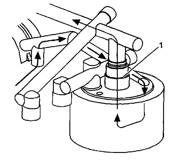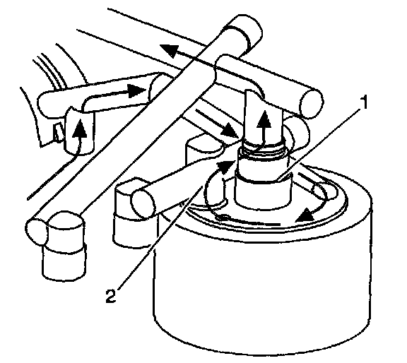 If the oil filter becomes plugged, the pressurized oil is diverted around the top of the oil filter. The oil filter bypass valve (1) is forced open, allowing the oil to continue on to the oil cooler and engine oil passages. No oil filtration occurs because the oil is not allowed into the oil filter.