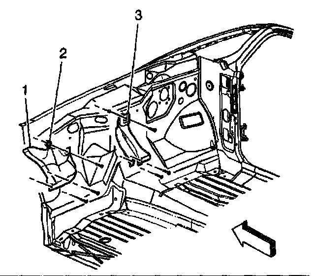 4. Remove the exhaust heat shield (1, 3) from the dash panel studs.