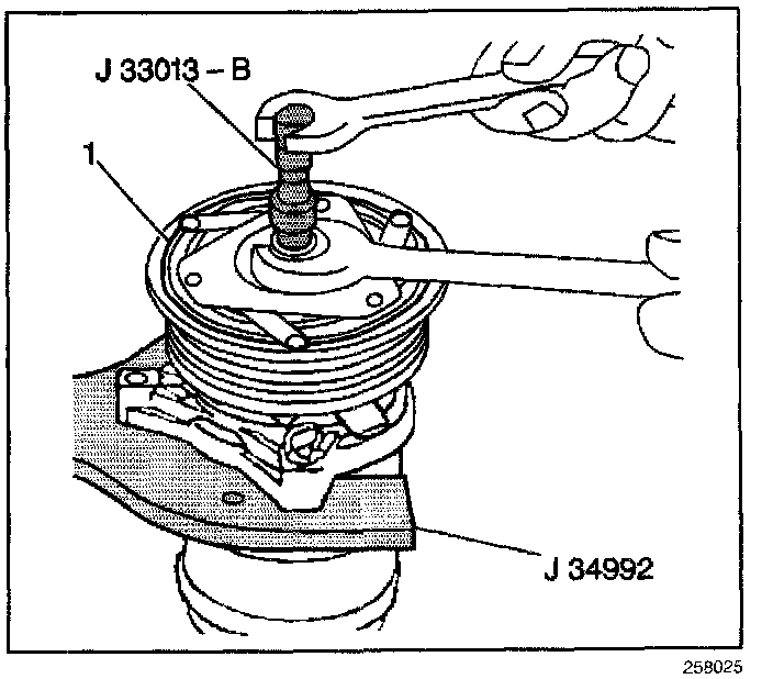 6. While holding the body of J 33013-B of the remover with a wrench, turn the center screw into the remover body in order to remove the clutch plate and hub assembly (1).