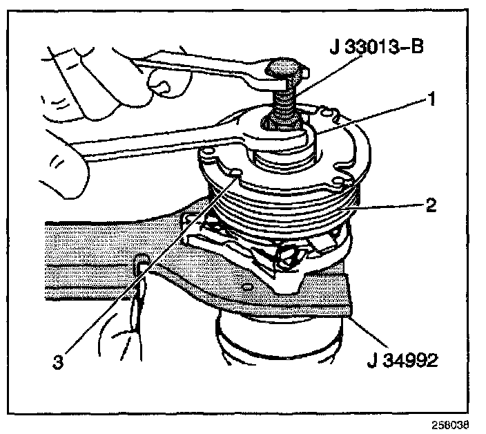 NOTE: Do not drive or pound on the clutch hub or shaft. Internal damage to the compressor may result. The forcing tip on the J 33013-B remover/installer center screw must be flat or the end of the shaft/axial plate assembly will be damaged.