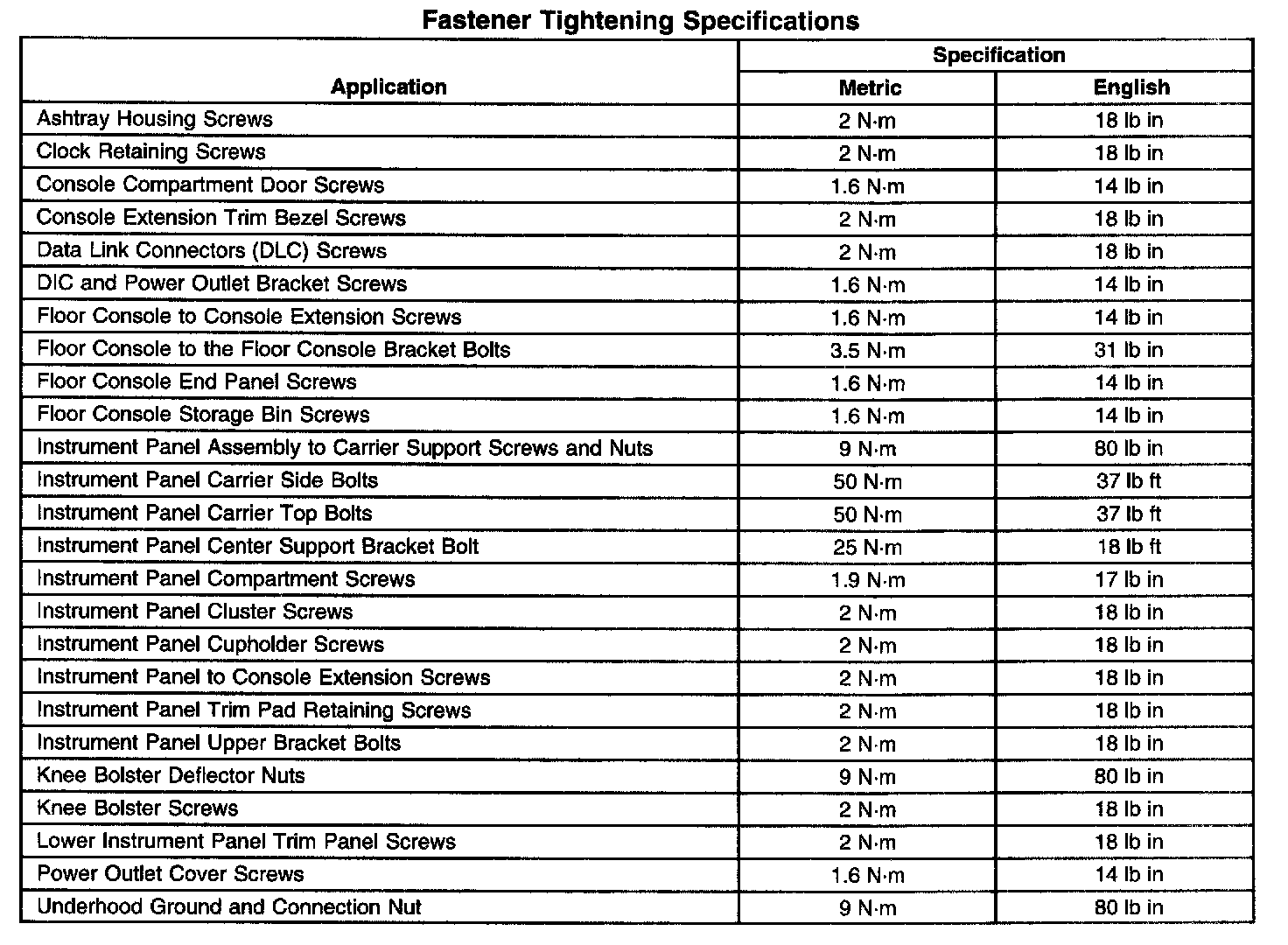 Instrument Panel, Gauges and Warning Indicators: Specifications